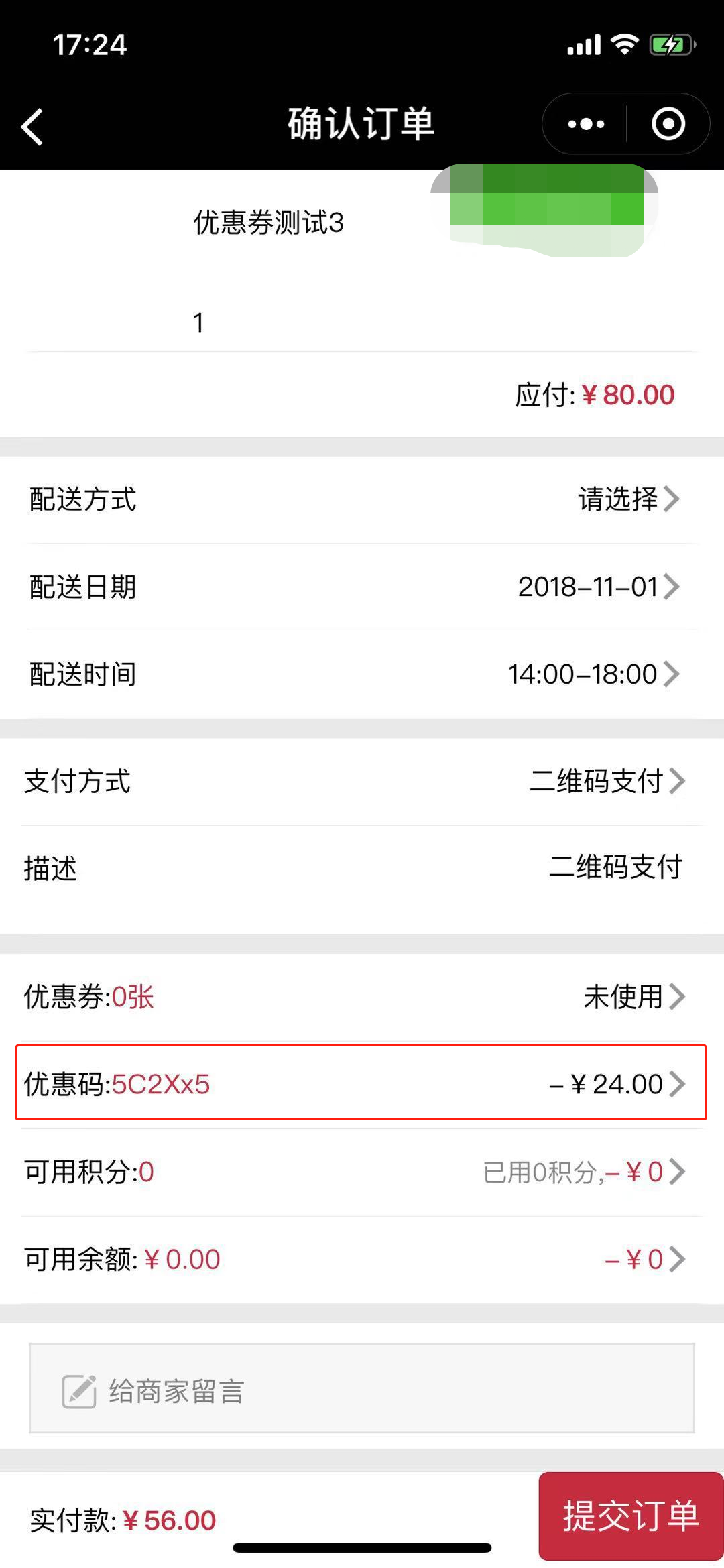 2.在pc端,使用优惠码的界面,输入优惠码后点击确定,即可看到优惠的金额。如图所示: